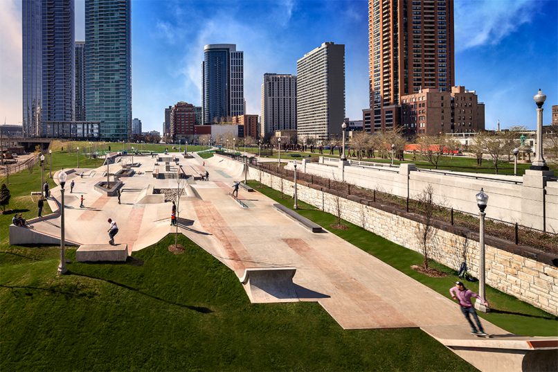 The Grant Park Skate Park was a joint effort with Chicago Park District, Grant Park Conservancy, and Altamanu landscape architects. After two years of construction, the skate park’s three acres of rails, stairs, and halfpipes are a popular community space.